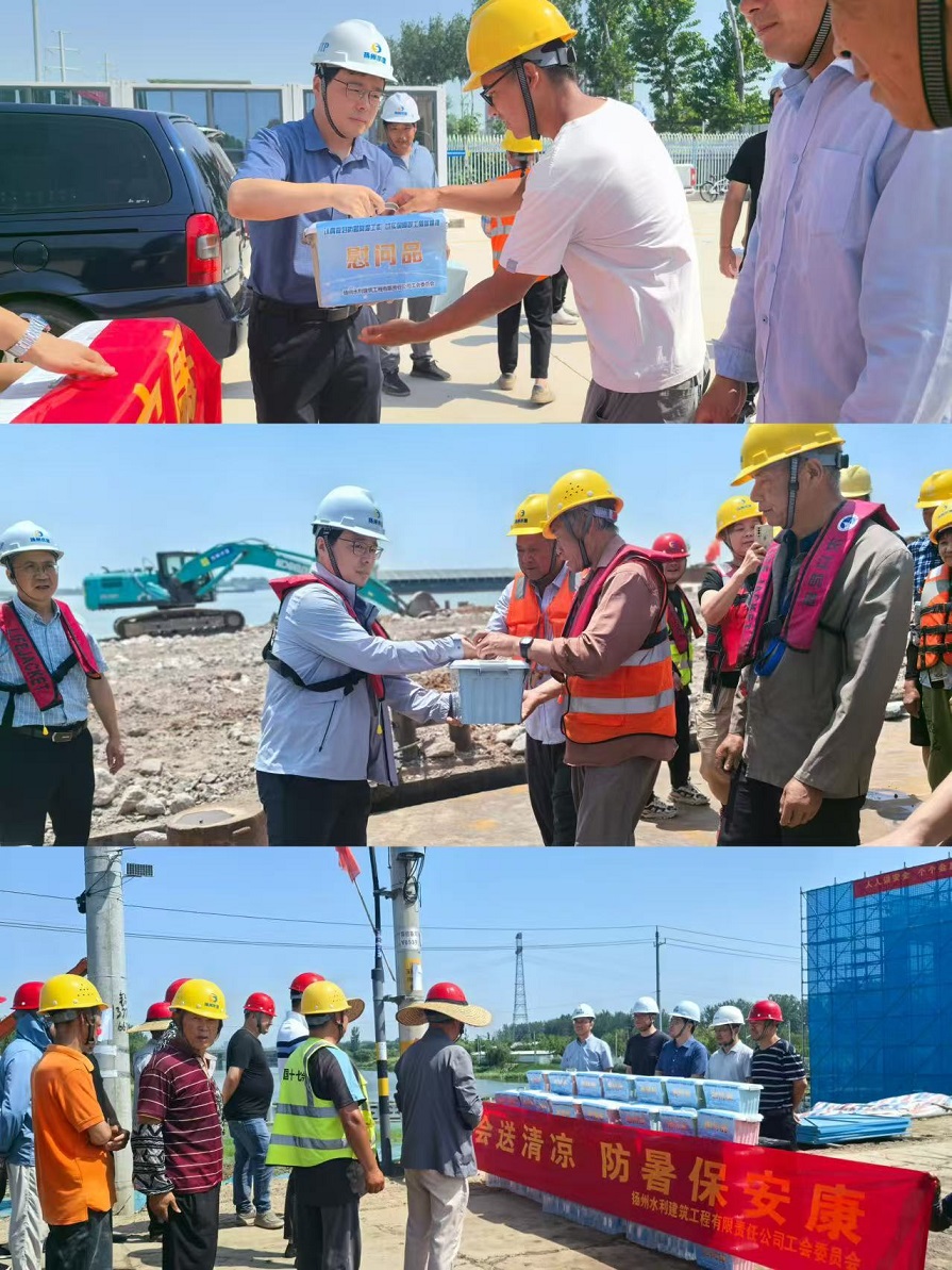 【概要描述】為切實(shí)保障高溫天氣下一線職工的身心健康,6月17日,揚(yáng)州水利建筑工程有限責(zé)任公司工會(huì)組織開展了“工會(huì)送清涼防暑保安康”夏送清涼活動(dòng),為堅(jiān)守在各項(xiàng)目一線的職工送去夏日清涼與組織關(guān)懷。農(nóng)投集團(tuán)副總經(jīng)理、揚(yáng)水建公司董事長張偉、公司分管副總、工會(huì)委員會(huì)委員及各項(xiàng)目部負(fù)責(zé)人?參加活動(dòng)?! ∥繂柦M先后走訪了揚(yáng)州經(jīng)濟(jì)技術(shù)開發(fā)區(qū)古運(yùn)河西北片區(qū)排澇治理二期工程施工標(biāo)、淮河入江水道右堤廖家溝(文昌大橋至羊尾巴段)應(yīng)急